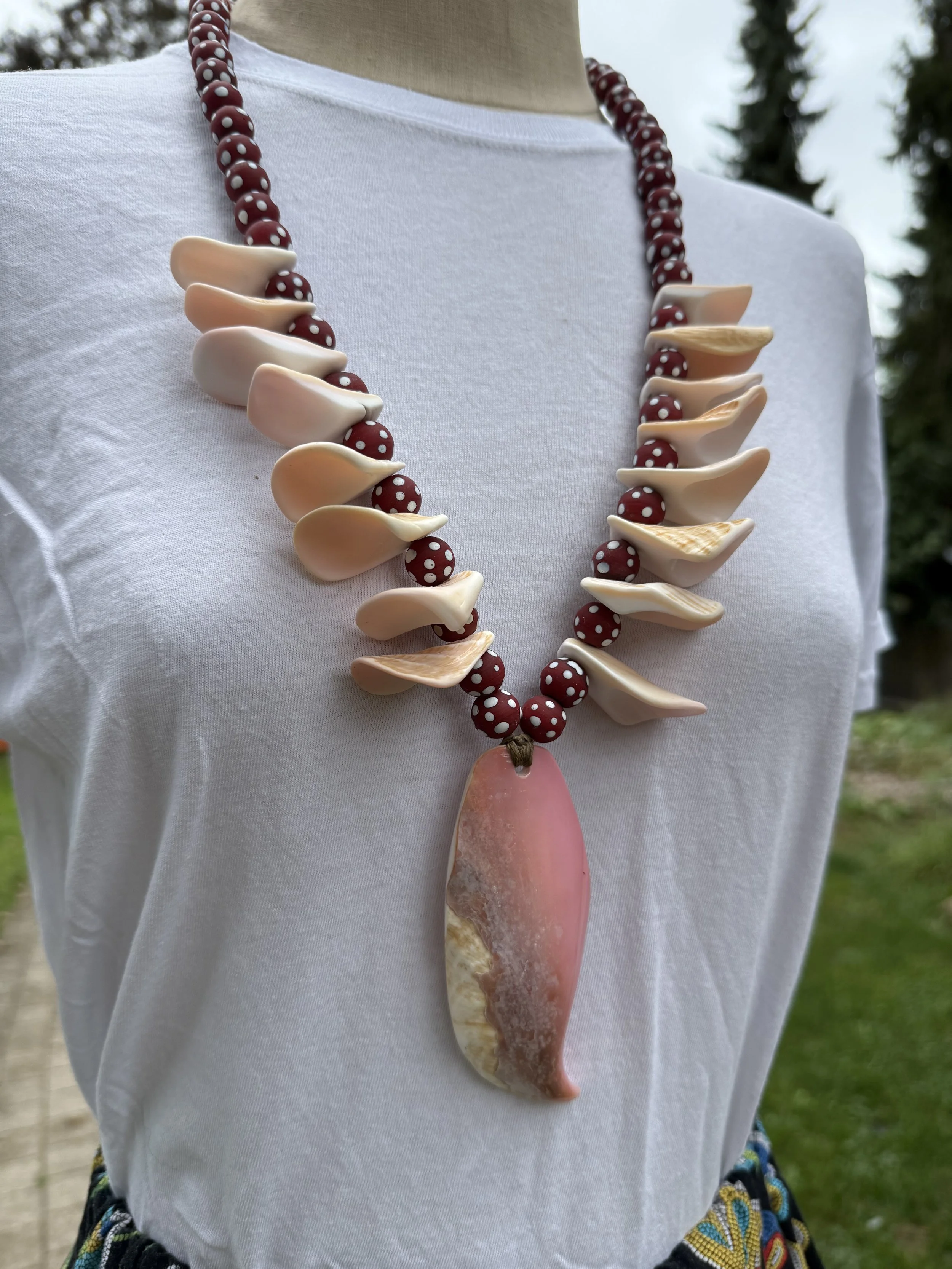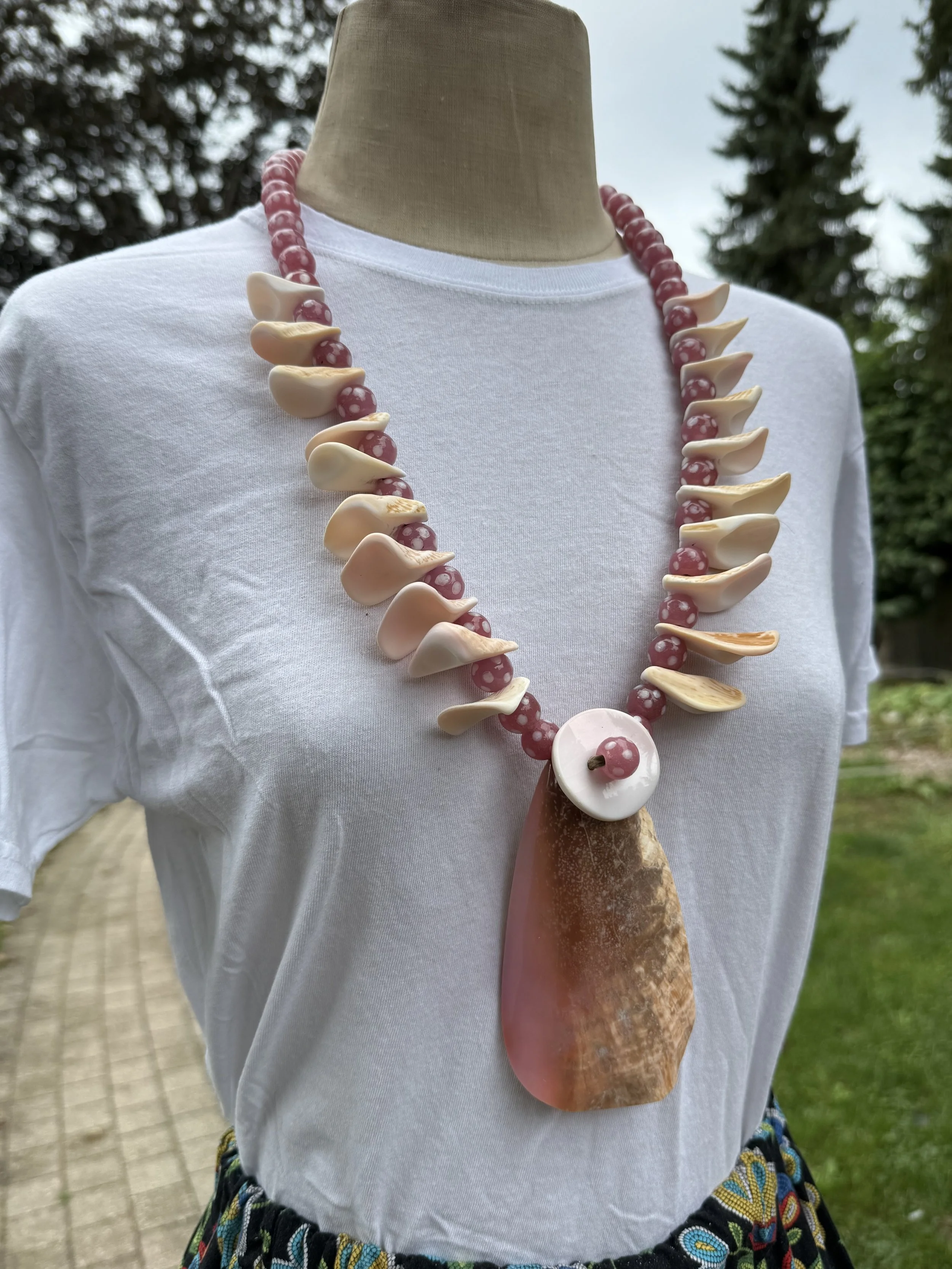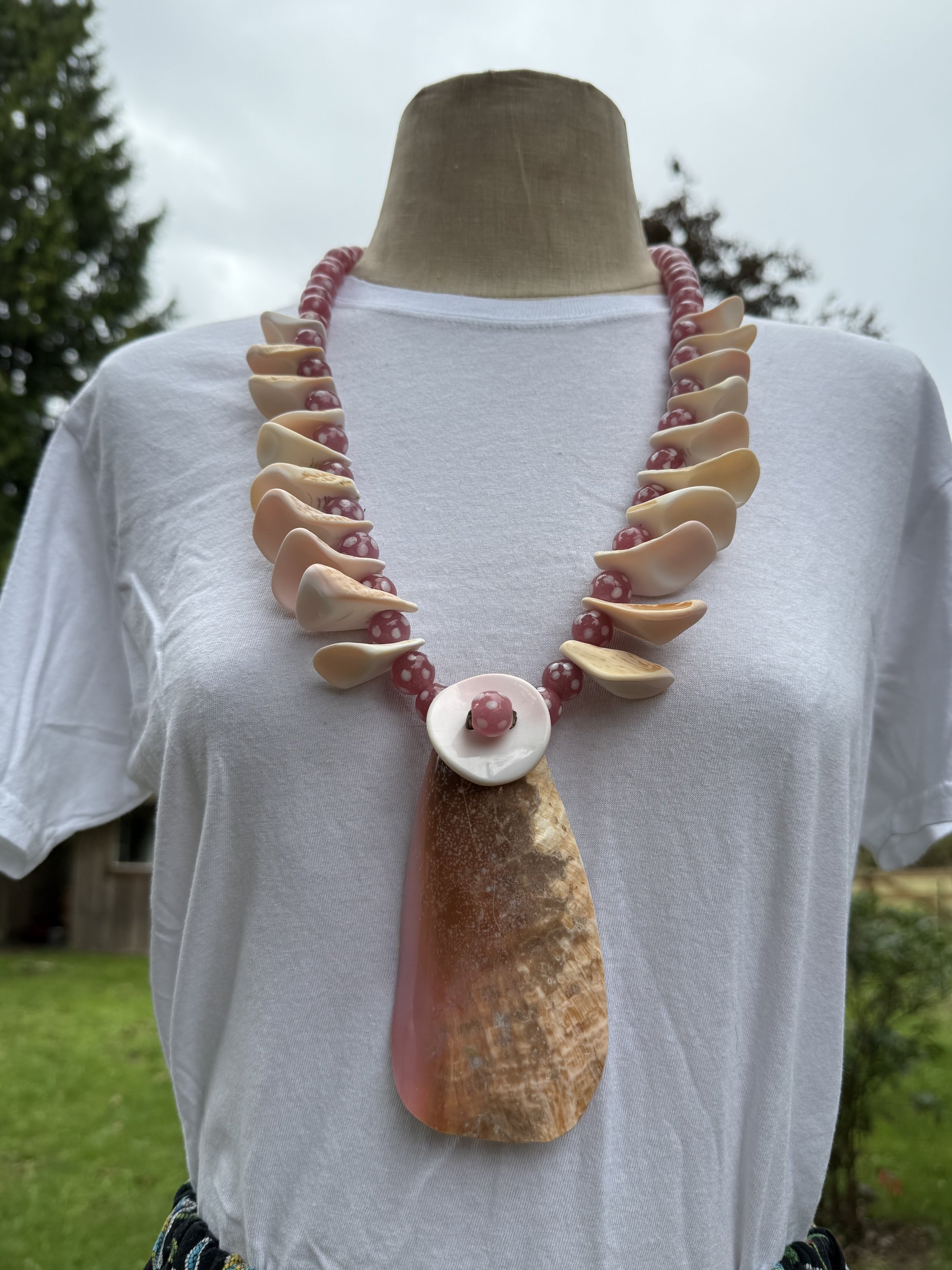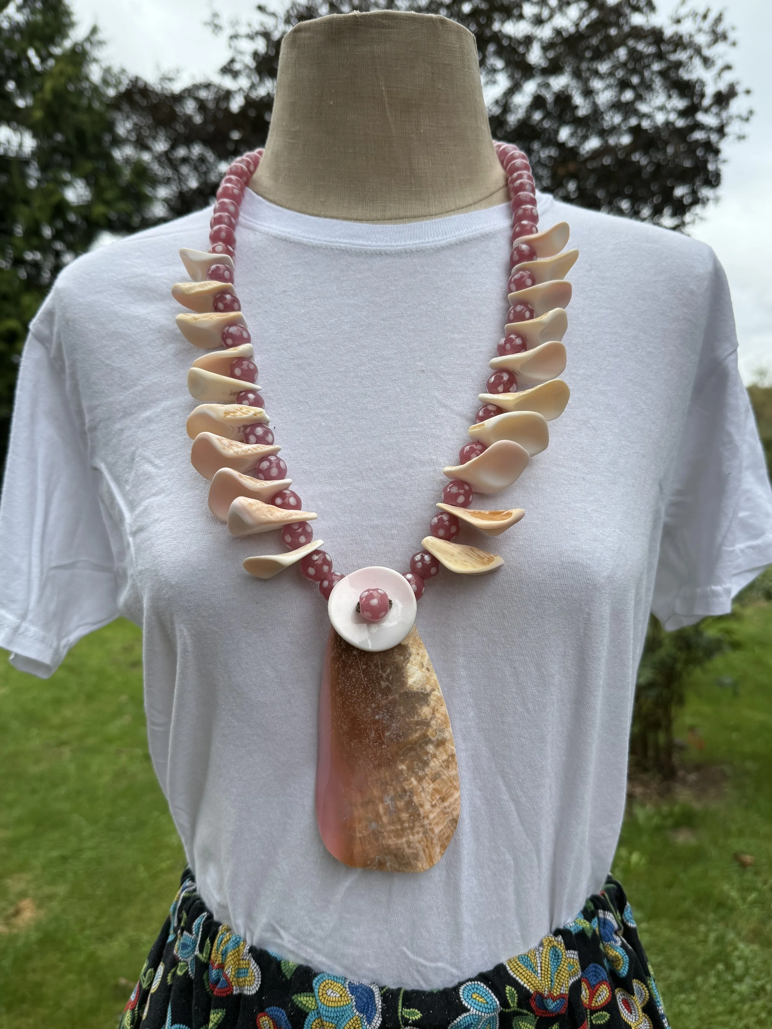 Hand carved black jade adze finished with recycled glass beads, brass beads, & moose hide leather backing.