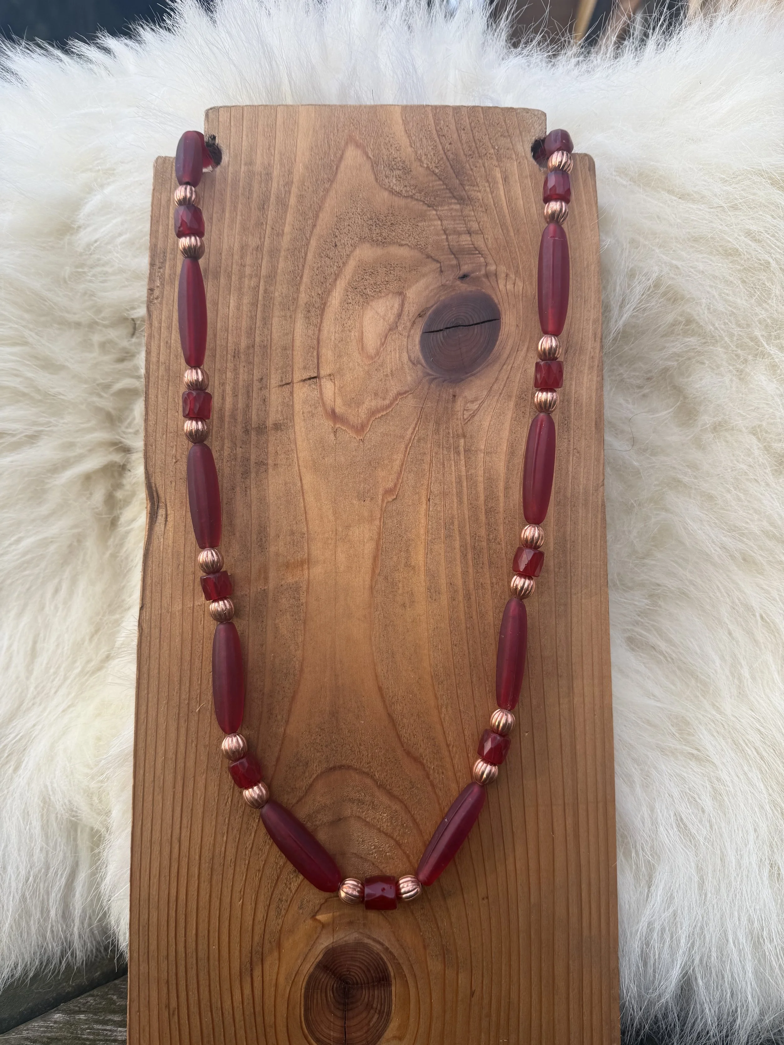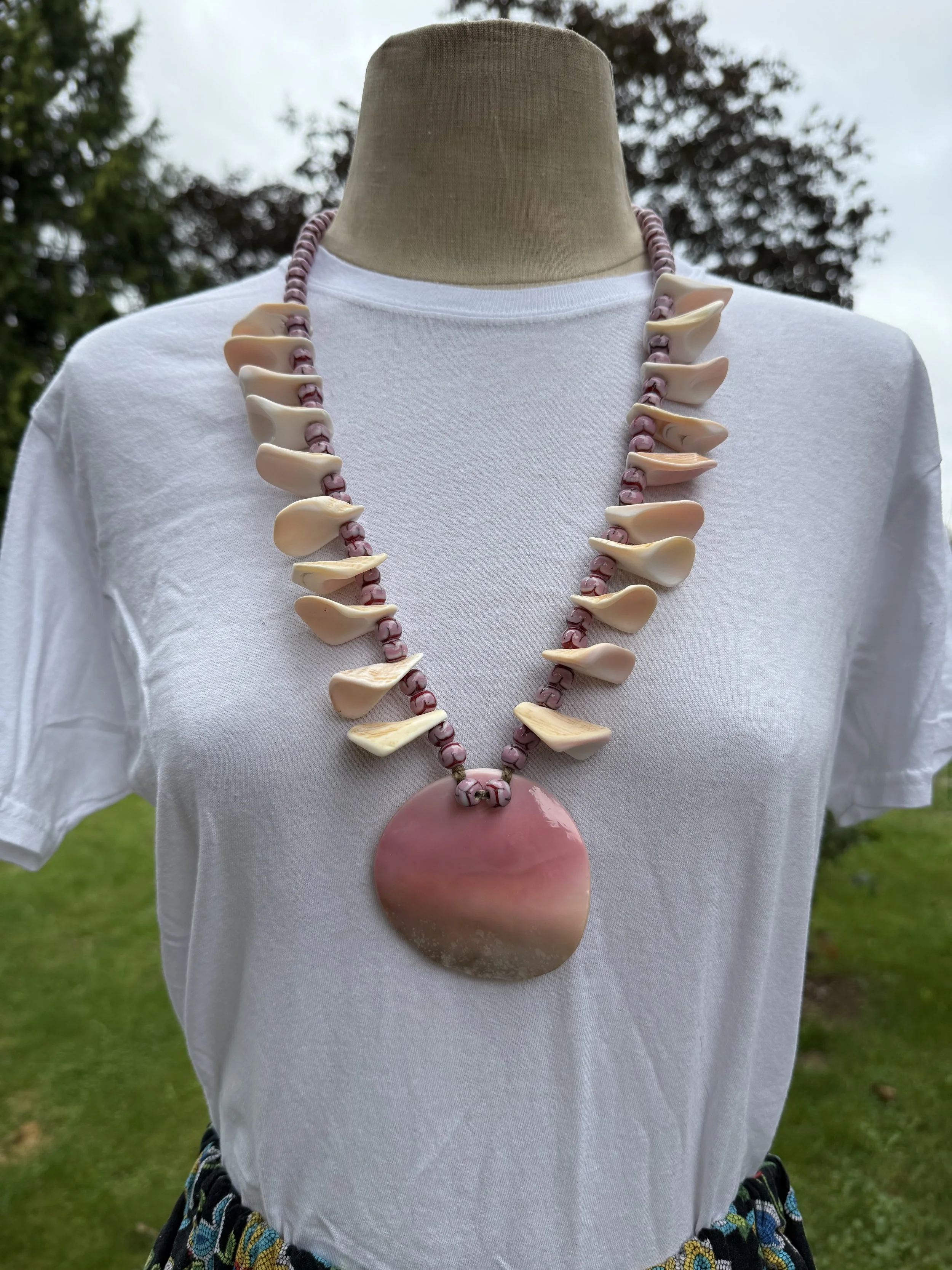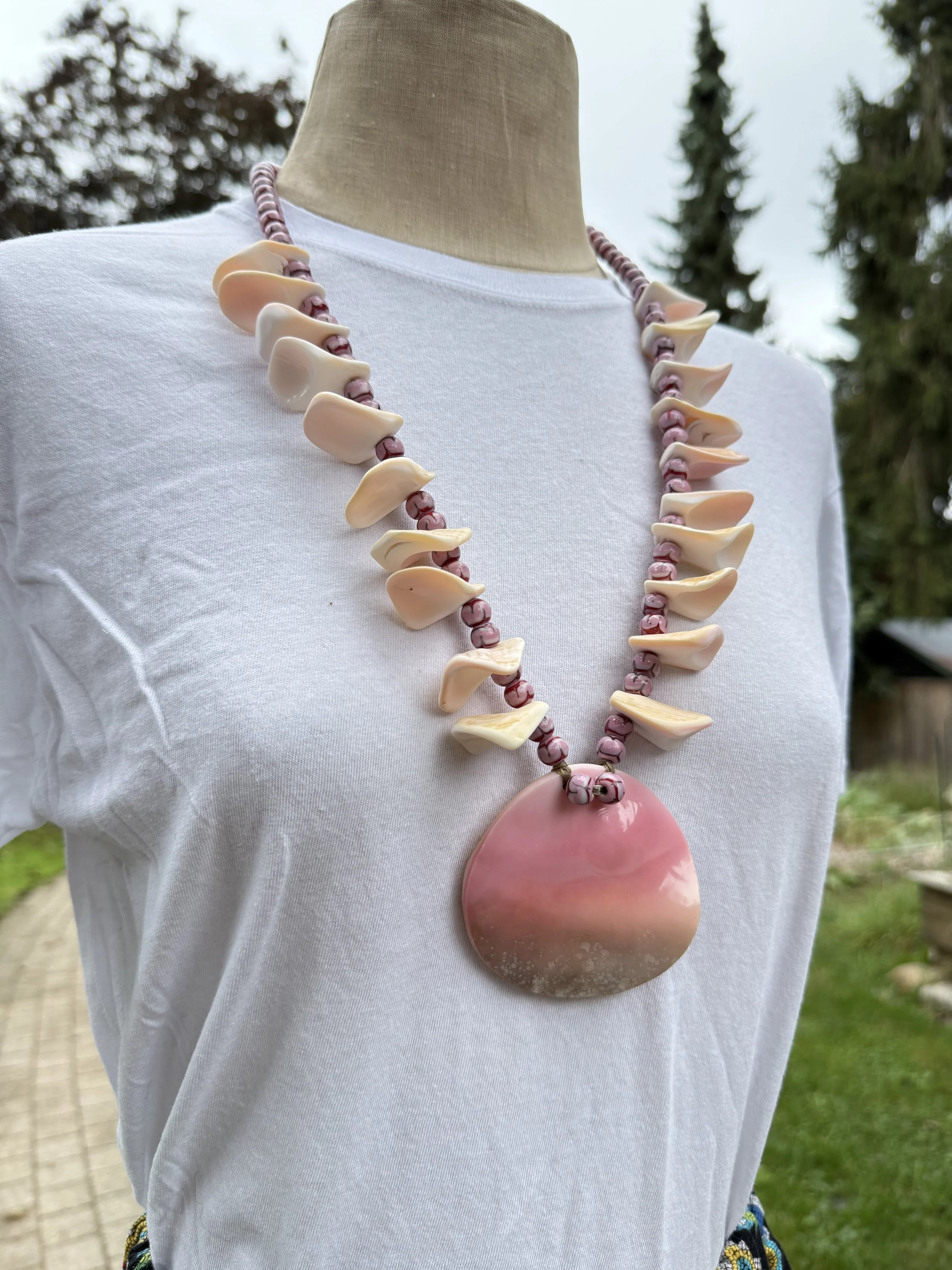 Hand carved black jade adze finished with recycled glass beads, brass beads, & moose hide leather backing.