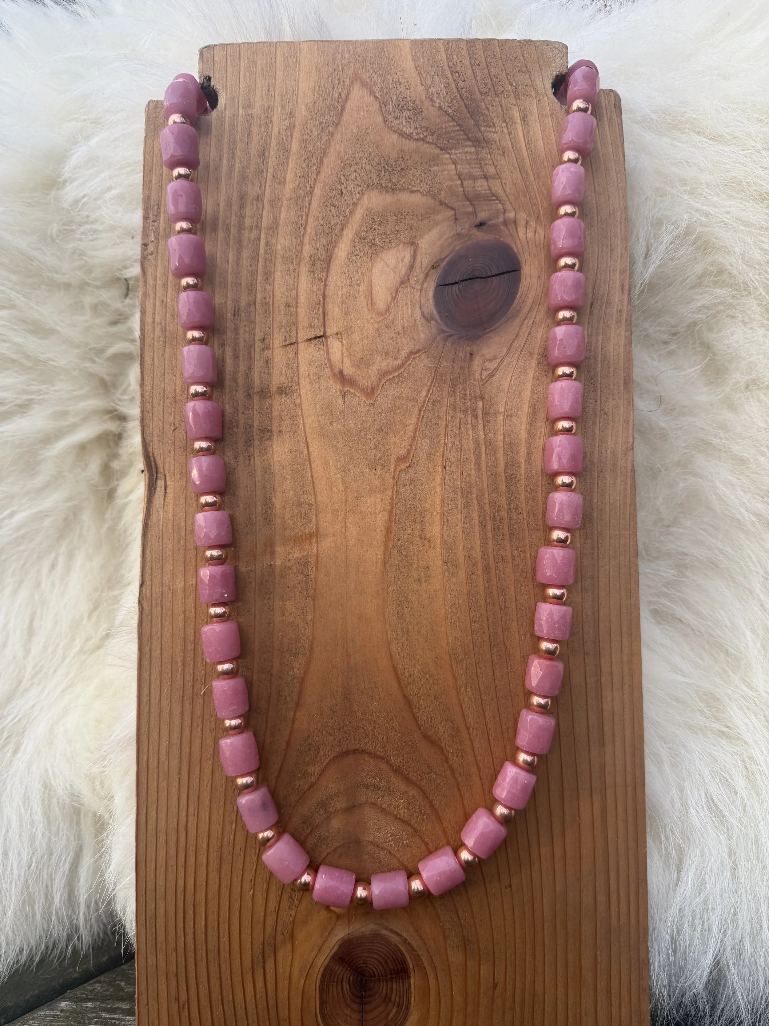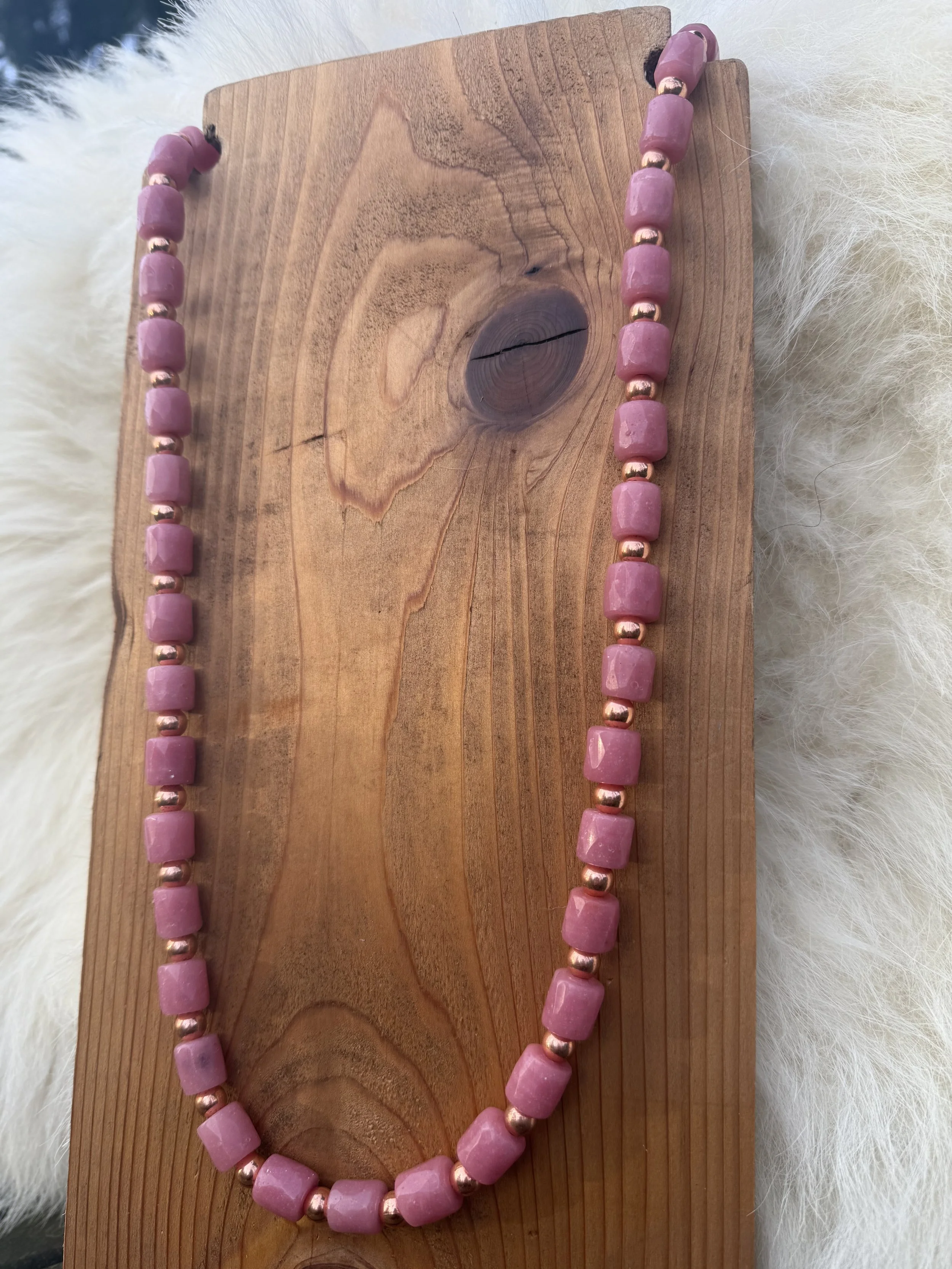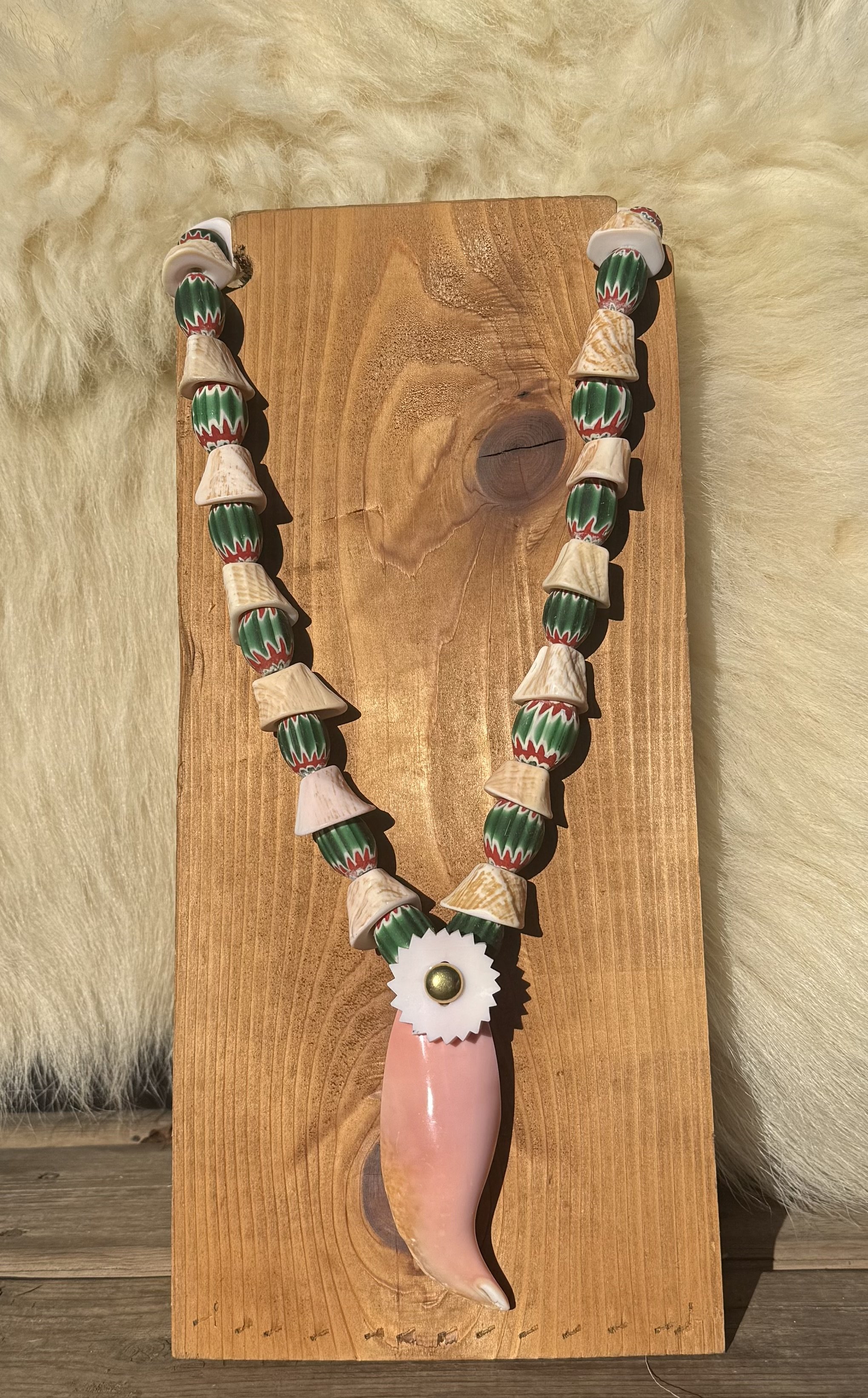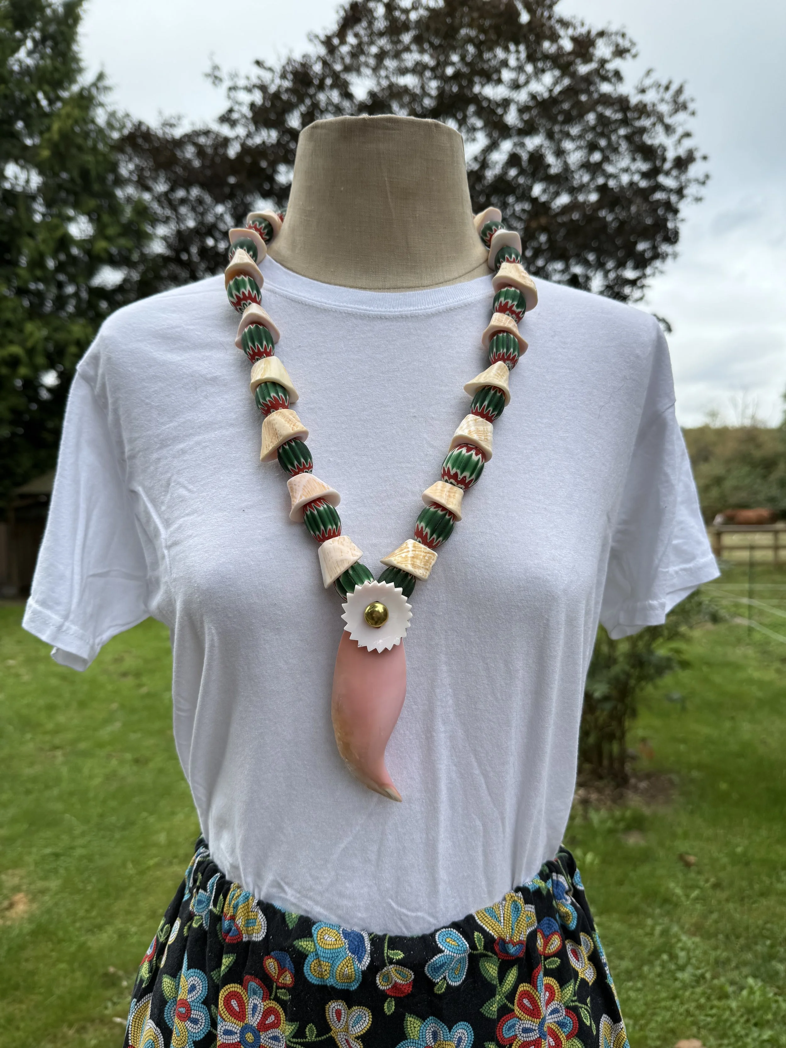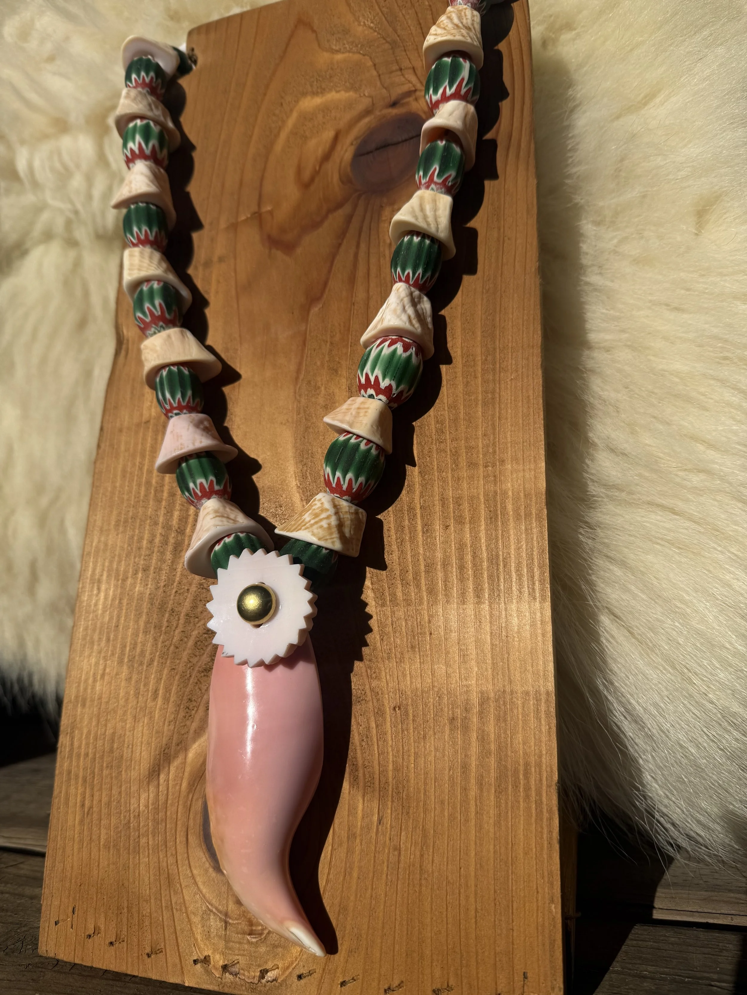 This necklace has a pink conch pendant, pink conch elk ivories. Finished with mini pink chevron beads.
