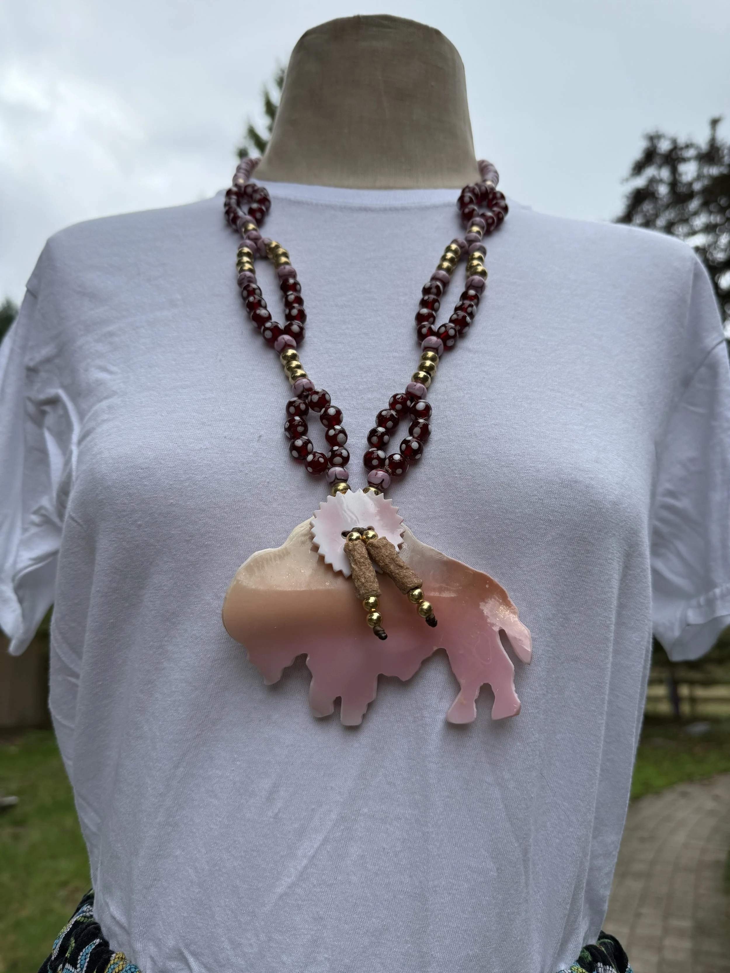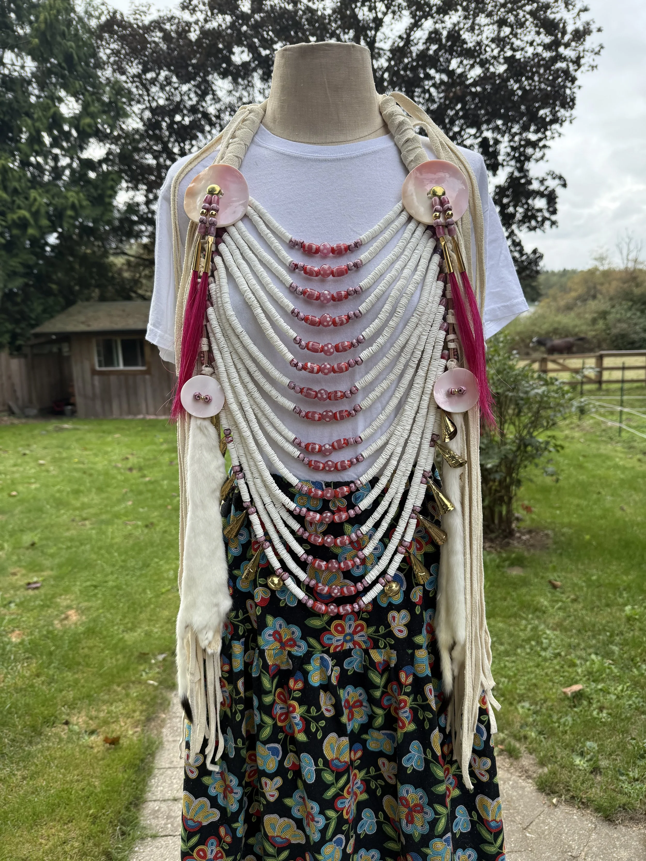 Cedar Stone’s purpose is to create each original piece not only as beautiful decorations or additions to regalia but, most importantly, as individual objects that empower their wearer’s connection to the sacred (sacred meaning not for everyone but special to the individual). The public’s recognition that these pieces are intended to strengthen their connection to the sacred is significant to their creators. Researching authentic artifacts, sourcing appropriate materials, and consciously making one-of-a-kind pieces requires a considerable time commitment and love of the craft. However, every time Jillian and Kevin witness people’s immediate positive reactions to their wearable art, they know their efforts were well worth it.